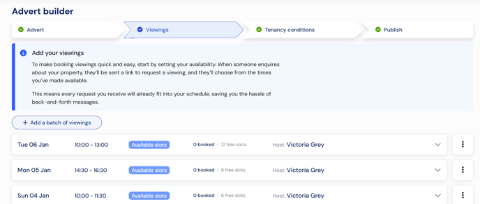 You can manage your viewings from two places; either the Viewings step of Advert builder (where you first set up your viewing batches), or the Viewings page of your Tenant Finder, that you'll see once you've published your advert.