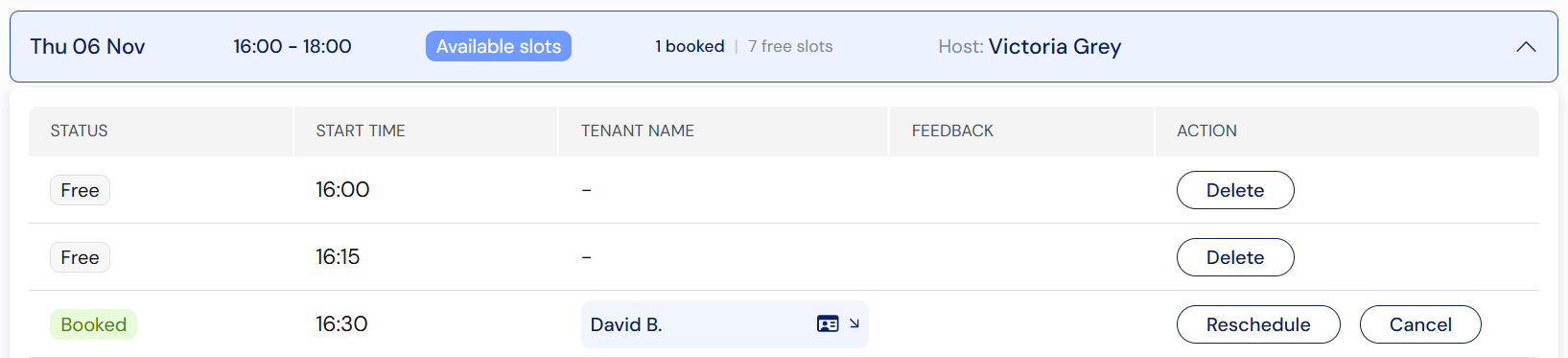 - Status of the block ('Available slots' if any slots remain available, 'Filled' if all slots are booked, 'Cancelled' if you delete the block, and 'Ended' if the viewings took place in the past)