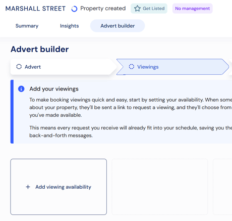 Before you can advertise the property, you need to provide your availability for viewings, so applicants can choose a number of options from the times you’ve made available. This means every request you receive will already fit into your schedule, saving you the hassle of back-and-forth messages. You can add your viewing availability from the Viewings step of Advert Builder.