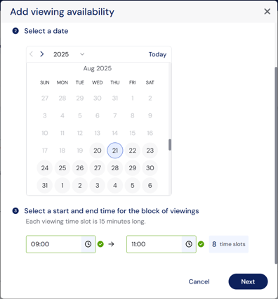 Click 'Add viewing availability', and choose from setting up an individual block of viewings or setting your general availability.