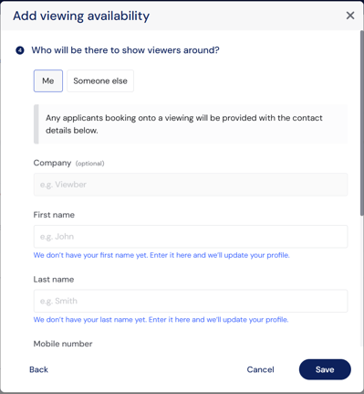 Click Next on either variation and add the details of who is meeting the renter at the property. We've defaulted it to you and filled in the details from your profile if you have added them. If you haven't completed your profile yet, you can add the details here instead and we'll save them to your profile. If someone else is meeting them, choose 'Someone else' and add their details.